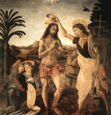 The earliest work of art associated with Leonardo is The Baptism of Christ (1472), a painting attributed to Verrocchio and on display at the Uffizi. This painting was clearly the work of different hands, and as Ser Vasari documented once again, Leonardo was among them. But while Leonardo was only one of several apprentices who contributed to the work’s creation, his skill and style so surpassed the rest that Verrocchio himself – so goes the story – put down his brush, never to paint again. While that may be exaggerated, almost all art historians agree that Leonardo painted the more beautiful of the two angels as well as the backdrop to the scene. There is also no doubt that both the figures painted by Leonardo and that of John the Baptist, most likely the work of Botticelli, reveal a modern spirit unlike any prior Florentine creation. The golden generation was rising. Leonardo was now a fully fledged artist; and so, our story comes to an end.