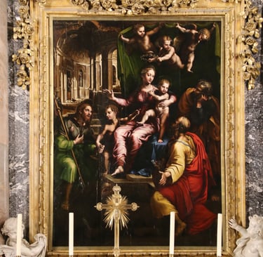 The figures, traditionally ascribed to Andrea Sansovino, are in fact a later copy by Lorenzetto, perhaps assisted by Raffaello da Montelupo.