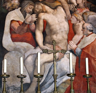 In the left aisle on the third pillar is the tomb of Ferdinando van der Eyden (+1630) made by F. Duquesnoy. The first chapel on the left, like St. Bennon’s in front, hosts a painting by Carlo Saraceni (1618) representing the Martyrdom of St. Lambertus; the next chapel, dedicated to St. John Nepomucenus is decorated by Ludovico Seitz at the end of the 18th century (Seitz is also the author of the Saints painted on the central nave’s vault). The chapel of St. Barbara, the third one, commissioned by Cardinal W. van Enckenvoirt, has on the walls stories of the saint made by the Dutch painter Michael Coxcie. The fourth chapel is decorated with wonderful mannerist frescoes (1530 ca) painted by Francesco Salviati. Particularly noted is his Deposition of Christ placed on the altar.