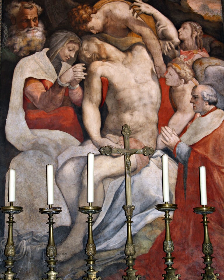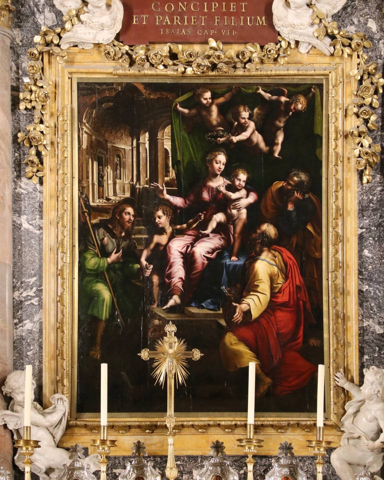 Entering the church we sense immediately a non-Roman atmosphere: the three naves have the same vertical height, typical device of the German Hallenkirchen. On the main altar there is the famous Fugger Altarpiece, painted by Giulio Romano in 1523ca. The painting represents a Holy Conversation. The Madonna and Child are in the middle with three little angels, with on the sides images of St. Mark, St. Joseph, St. Jacob and St. John as a child. The setting has a classical taste and reminds of Vitruvius studies, Vasari talks about a “casamento che gira ad uso di teatro[4]”. On the back an old spinning woman comes out of a little door, close to her a hen and her little chicks are perking up the landscape. On the right hand side we see the monument of Pope Adrian VI (1522-1523), conceived by Baldassare Peruzzi with marbles made by Michelangelo Senese and Tribolo. Adrian Florensz, son of an Utrecht’s carpenter, later Charles V’s tutor, has been the last non-Italian Pope before John Paul II. Shortly after his election, on his way from Spain to Rome,. He immediately took the first steps for church reform. During his short pontificate he tried to reform the Curia and blocked many artistic works except the Fabbrica of S. Pietro .He was not at all fond of Humanists and Poets like Leo X before him. Speaking about the Laocoon, found some years before in the Domus Aurea, he said that is was a “useless image of pagan idols”, he even thought about plastering Michelangelo’s frescoes in the Sistine Chapel, scandalized by all that nudity.