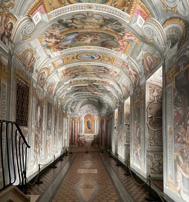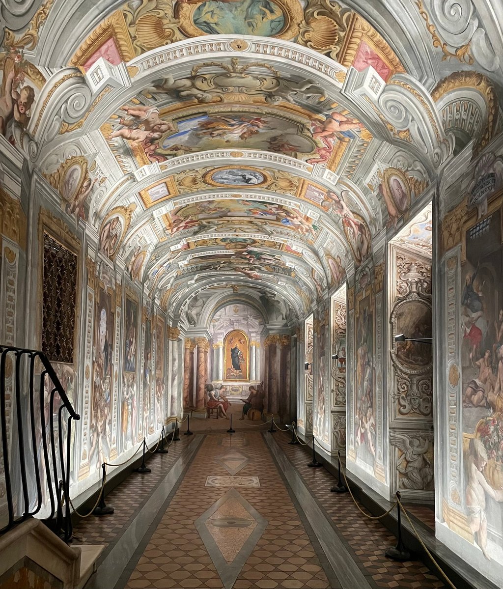 Our visit will explore themes of religion, war, political power, military background, mysteries, and also social justice, ecumenical dialogue, and the significance of spirituality and art as tools for evangelical missions. We will begin by admiring Andrea Pozzo’s most famous work: the vault and the faux dome inside the Church of St. Ignatius. The effect will be powerful, but to truly understand his skill and the meaning of anamorphosis, we’ll continue by discovering the corridor he painted in the rooms of St. Ignatius.These rooms are a 5-minute walk from our meeting point, within the House of the Order. Nearby, we’ll enter the Jesuits’ main church: the Gesù. After a brief visit to the church, we’ll end our tour by watching the surprising Machina Barocca show (here the text of the Machina in english). Above the tomb of Ignatius, surrounded by art and music, we’ll witness the dramatic unveiling of the massive silver statue of the saint, floating straight to Heaven.
